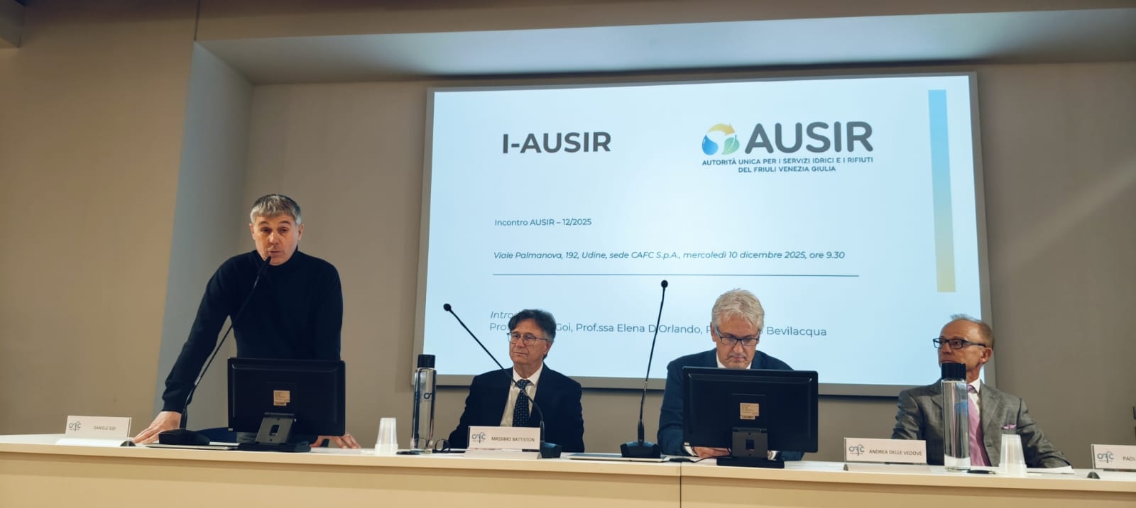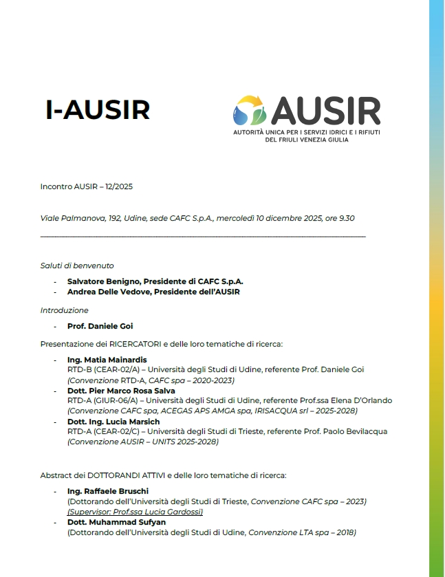 Nella sede di CAFC spa di via Palmanova a Udine, si è svolto il 2° I-AUSIR, promosso da AUSIR, UNIUD e UNITS per la presentazione di tre neo ricercatori che sono stati sostenuti economicamente dai Gestori e da AUSIR in un programma di collaborazione, stipulato lo scorso aprile (Convenzione Quadro). Gli I-AUSIR (Incontri AUSIR) sono incontri dal tenore di tavolo tecnico-scientifico, che riguardano risorsa acqua e i rifiuti, descrittivi di: attività realizzate, pianificazioni future di nuove ricerche applicate, interazioni ed integrazioni tecnico-scientifiche su temi di ricerca e sviluppo sul territorio, e altro. Gli incontri si svolgono in un contesto non aperto al pubblico, ma unendo, collegando ed informando gli addetti ai lavori di tutte le realtà coinvolte nella Convenzione.